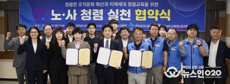 (뉴스인020 = 김성길 기자) 전라남도교육청은 30일 청사 비즈니스실에서 전남교사노동조합, 전라남도교육청노동조합과 ‘청렴 실천 협약(MOU)’을 맺고 청렴한 조직문화 확산과 미래세대 청렴교육 강화를 약속했다.