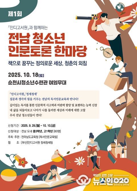 (뉴스인020 = 김성길 기자) 전라남도교육청은 10월 18일 순천시청소년수련관 야외무대에서‘제1회 전남 청소년 인문토론 한마당’을 연다.