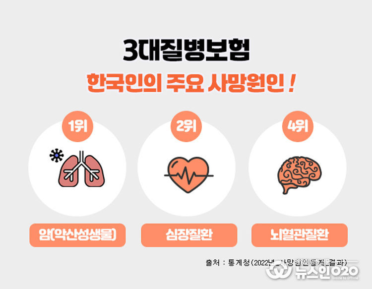 (뉴스인020 = 김성길 기자) 3대질병으로 일컬어지는 암, 뇌혈관질환, 심혈관질환은 한국인의 주요 사망원인에서 상위를 차지하고 있으며, 이에 대한 진단비를 집중적으로 보장해 주는 보험상품을 3대질병진단비 보험이라 할 수 있다.