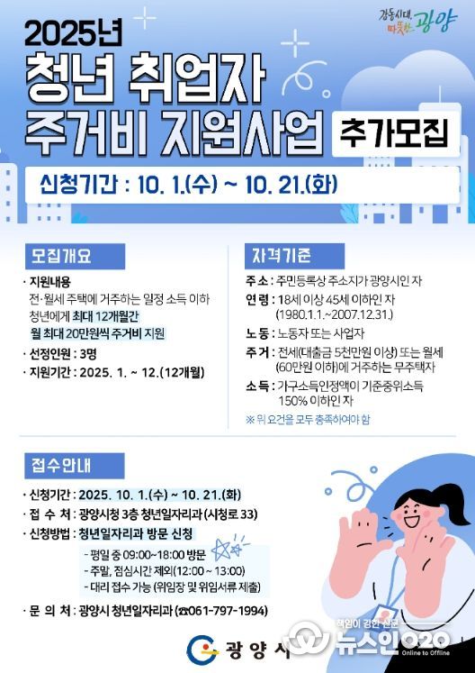 (뉴스인020 = 김성길 기자) 광양시는 청년들의 주거 안정을 위해 10월 1일부터 21일까지 ‘2025년 청년 취업자 주거비 지원사업’ 추가 모집을 진행한다고 밝혔다.