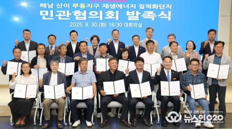 (뉴스인020 = 김성길 기자) 해남군은 9월 30일 해남군청 대회의실에서‘해남 산이 부동지구 재생에너지 집적화단지 민관협의회’발족식을 개최하고, 대규모 재생에너지 집적화단지 조성을 위한 본격적인 민관 협력 체계 구축에 나섰다.