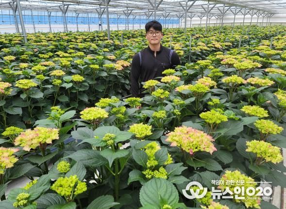 김승찬 대표는 한국농수산대학 화훼학과 출신의 청년 농업인으로, 2023년부터 현대식 스마트팜 하우스를 신축해 수국 재배를 본격화했다.