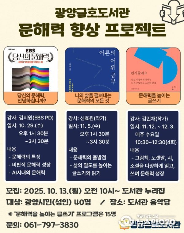 (뉴스인020 = 김성길 기자) 광양금호도서관이 성인들의 문해력 향상을 위해 오는 10월 29일부터 12월 3일까지 매주 수요일 시민독서학교를 운영한다.