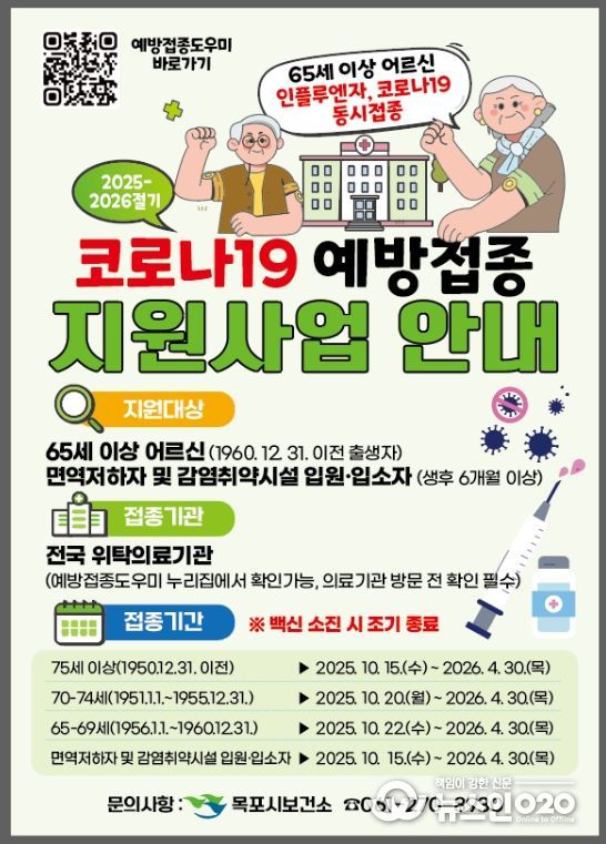 (뉴스인020 = 김성길 기자) 목포시는 겨울철 코로나19 확산을 방지하고 중증 및 사망을 예방하기 위해 고위험군을 대상으로 오는 10월 15일부터 코로나19 무료 예방접종을 실시한다.