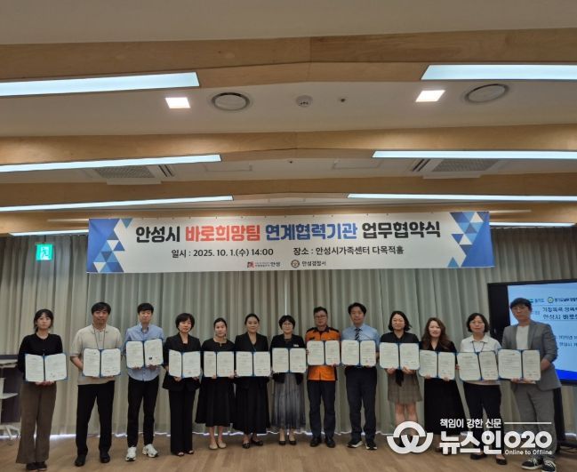 (뉴스인020 = 김성길 기자) 안성시는 지난 10월 1일 안성시가족센터 다목적홀에서 가정폭력․성폭력 등 112신고 피해자에 대한 ‘원스톱 통합지원’을 위하여 업무협약(MOU)을 체결했다.