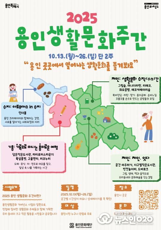 (뉴스인020 = 김성길 기자) (재)용인문화재단은 시민 주도의 생활문화 확산을 위해 ‘2025 용인생활문화주간(10.13.~10.26.)’ 사업을 용인 곳곳에서 운영하고 있다.