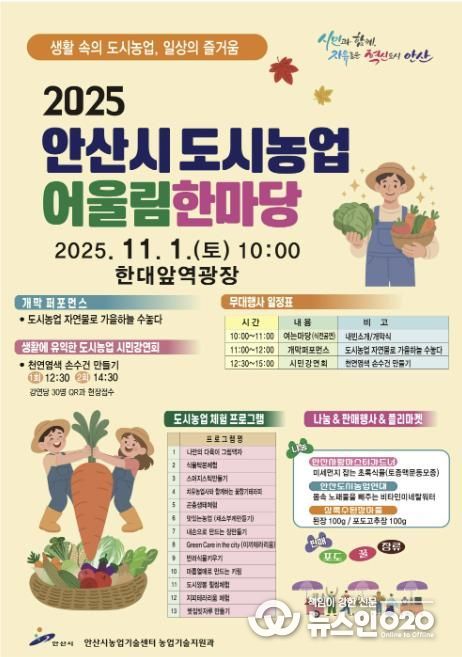 (뉴스인020 = 김성길 기자) 안산시는 11월 1일 한대앞역 광장 일원에서 ‘안산시 도시농업 어울림한마당’을 개최한다고 21일 밝혔다.