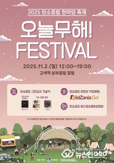 (뉴스인020 = 기자) 수원특례시는 11월 2일 정오부터 오후 7시까지 고색역 상부 공원 일원에서 제1회 탄소중립 한마당 축제 ‘오늘무해! 페스티벌’을 연다.