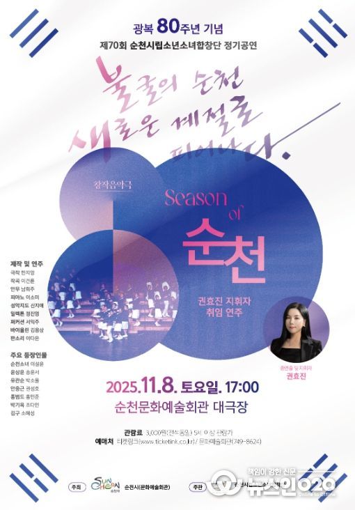 (뉴스인020 = 김성길 기자) 순천시는 오는 8일 토요일 오후 5시, 순천문화예술회관 대극장에서 순천시립소년소녀합창단 제70회 정기연주회 창작합창음악극 'Season of 순천'을 개최한다고 밝혔다.