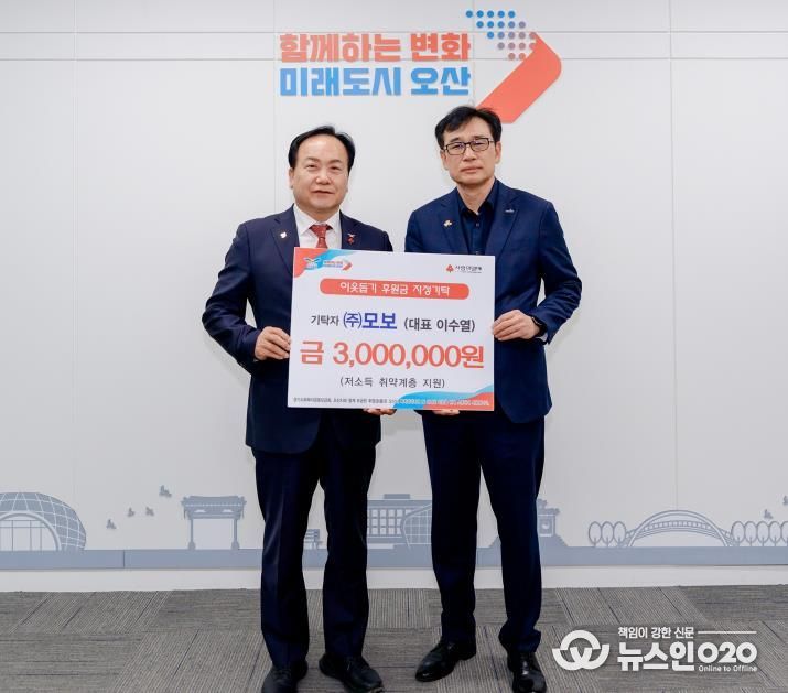 (뉴스인020 = 김성길 기자) 오산시는 지난 16일 ㈜모보로부터 지역 내 저소득 취약계층 지원을 위한 후원금 300만 원을 기탁받았다고 밝혔다.