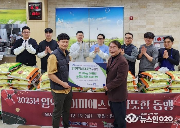 (뉴스인020 = 김성길 기자) 원익IPS는 12월 19일, 평택북부노인복지관에 쌀 20kg 60포와 온누리 상품권 4,000,000원을 기부하며 따뜻한 나눔을 실천했다. 이번 전달식은 지역사회 나눔 문화 확산에 앞장서 온 원익IPS의 꾸준한 사회공헌 활동의 일환으로, 지역 내 어르신들에게 실질적인 도움을 주기 위한 의미있는 기부로 진행됐다.