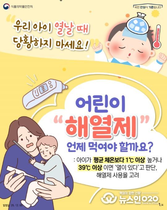 (뉴스인020 = 김나현 기자) 식품의약품안전처 소속 식품의약품안전평가원(원장 강석연)은 겨울철에는 고열이 동반된 감기 및 독감 환자의 해열제 사용이 늘어남에 따라, 소아 해열제의 올바른 사용방법을 안내한다고 밝혔다.