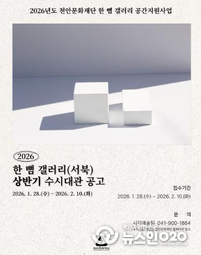 (뉴스인020 = 김성길 기자) (재)천안문화재단은 오는 28일부터 상반기 한 뼘 갤러리 수시대관 공모 접수를 받는다고 27일 밝혔다.