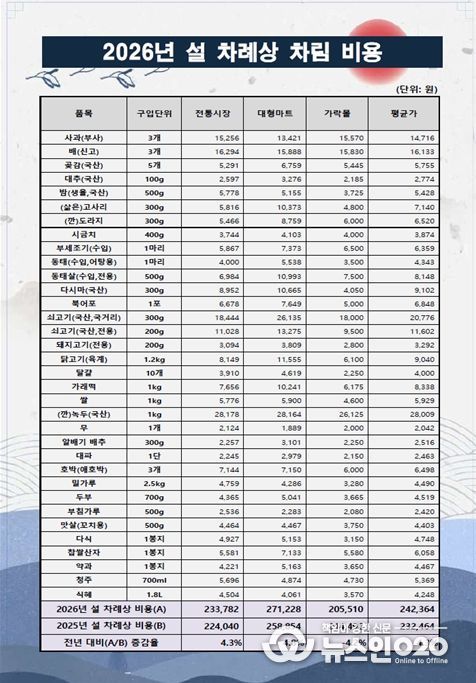 (뉴스인020 = 김성길 기자) 서울시농수산식품공사는 설 명절 장보기에 도움이 되는 정보를 시민에게 제공하고, 설 성수기 가격 안정을 위한 정보 제공 차원에서 서울시 내 대형마트, 전통시장, 가락시장(가락몰) 등 총 25개소를 대상으로 실시한 ‘설 차례상 차림 비용’ 조사 결과를 발표했다.