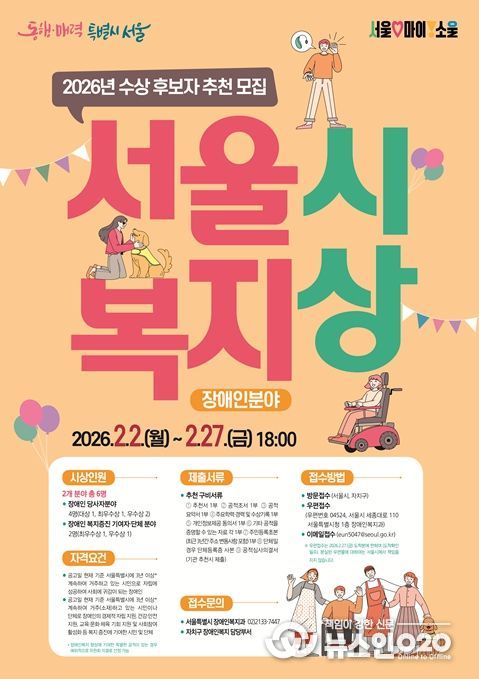 (뉴스인020 = 김성길 기자) 서울시가 27일까지 ‘2026년 서울시 복지상(장애인분야)’ 수상 후보자를 모집한다.