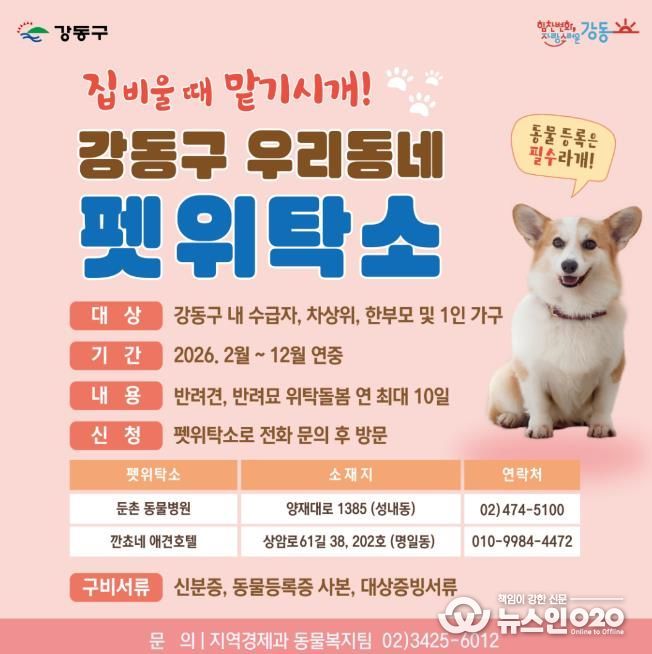 (뉴스인020 = 김성길 기자) 서울 강동구는 설 명절을 맞아 장기간 외출하거나 입원해야 하는 상황에서 반려동물 돌봄 여건이 어려운 주민을 지원하기 위해, 2월부터 ‘우리동네 펫위탁소’를 연중 상시 운영한다고 밝혔다.