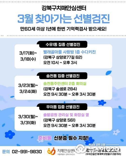 (뉴스인020 = 김성길 기자) 서울 강북구 강북구치매안심센터가 지역 주민의 치매 조기 발견과 예방을 위해 3월 중 ‘찾아가는 집중 선별검진(기억력 검사)’을 운영한다.