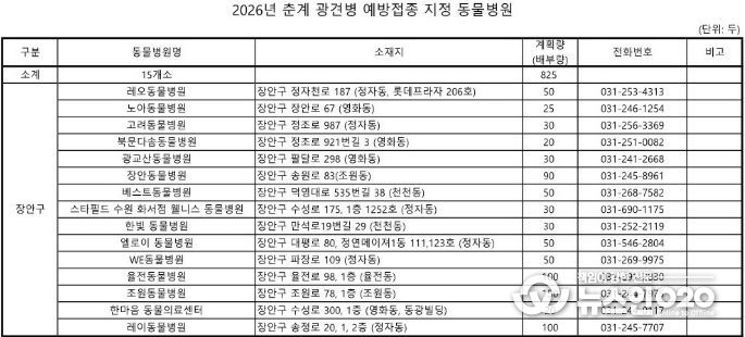 (뉴스인020 = 김성길 기자) 수원시 장안구는 4월 6일부터 4월 26일까지 2026년 춘계 광견병 예방접종을 추진한다고 밝혔다.
