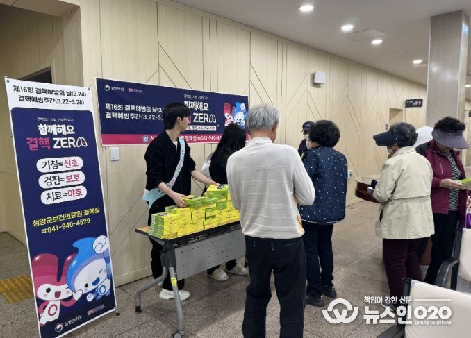 (뉴스인020 = 김성길 기자) 청양군이 ‘제16회 결핵 예방의 날(3월 24일)’을 기념해 결핵예방주간동안 지역 사회 내 감염 확산을 차단하고 예방 수칙 실천을 독려하기 위한 집중 캠페인을 전개했다고 1일 밝혔다.