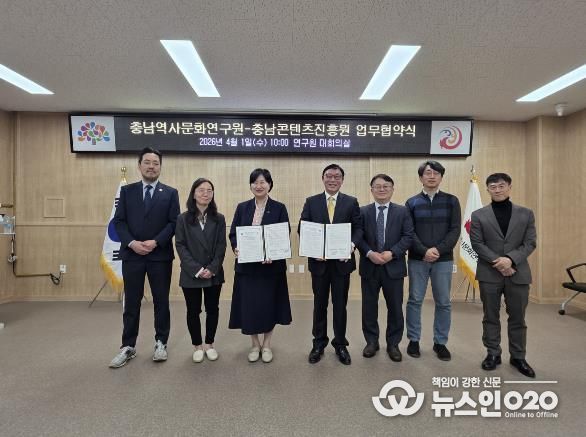 이날 양 기관은 협약에 따라 ▲충남 역사·문화 콘텐츠 공동 기획 및 제작·유통 ▲관련 교육·세미나·포럼 공동 개최 ▲인적·물적 자원 및 정보 교류 등 다양한 분야에서 긴밀한 협조 체계를 가동하기로 했다.