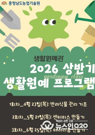 (뉴스인020 = 김성길 기자) 충남도 농업기술원은 도민의 생활 속 식물문화 확산을 위해 ‘2026년 상반기 생활원예 프로그램’ 일반인 과정 참여자를 모집한다고 2일 밝혔다.