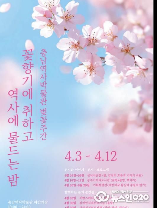 (뉴스인020 = 김성길 기자) 충청남도역사박물관은 벚꽃 개화를 맞아 오는 4월 3일부터 12일까지 열흘간 벚꽃 주간 행사 '꽃향기에 취하고 역사에 물드는 밤'을 운영한다고 밝혔다.