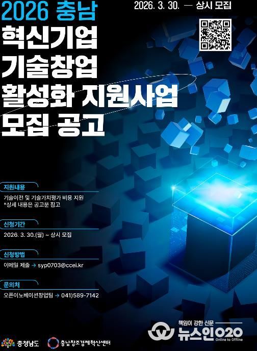(뉴스인020 = 김성길 기자) 충남창조경제혁신센터가 지역 창업기업의 기술 경쟁력을 높이고 성공적인 사업화를 돕기 위해 ‘2026년 충남 혁신기업 기술창업 활성화 지원사업’을 시행하고 참여 기업을 모집한다고 밝혔다.