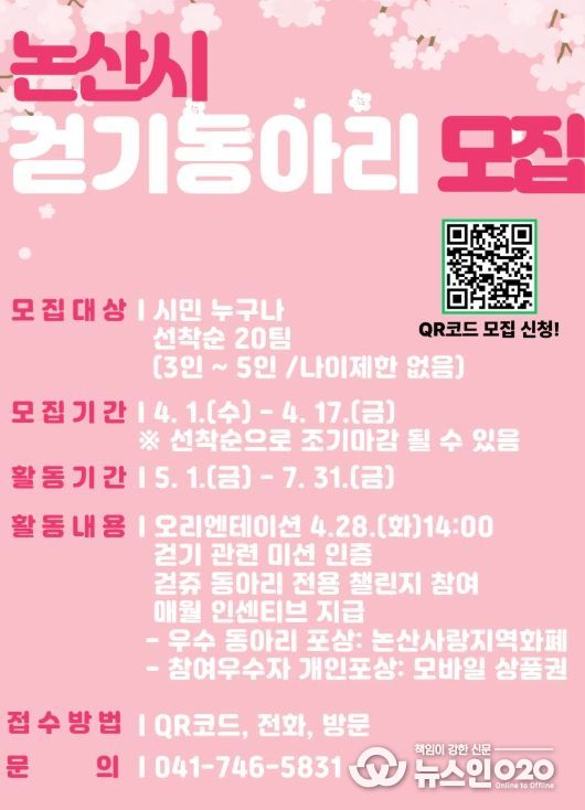 (뉴스인020 = 김성길 기자) 논산시는 오는 17일까지‘비대면 걷기동아리’참여자를 모집한다.