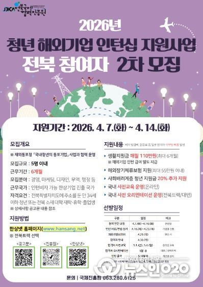 지원 대상은 만 34세 이하 전북 청년으로, 전북 거주자 또는 도내 대학 재·휴학생 및 졸업생 등 일정 요건을 충족해야 한다. 해외 근무가 가능한 경우 누구나 지원할 수 있으며, 참여를 희망하는 청년은 4월 7일부터 14일 18시까지 한상넷 홈페이지를 통해 온라인으로 신청하면 된다. 이후 기업별 서류 및 면접 심사를 거쳐 최종 선발될 예정이다.