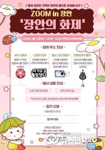 (뉴스인020 = 김성길 기자) 수원시청소년청년재단 장안청소년청년센터는 오는 4월 11일, 봄의 낭만을 가득 담은 프로그램 ZOOM IN 장안 ‘장안의 화제’를 개최한다고 밝혔다.