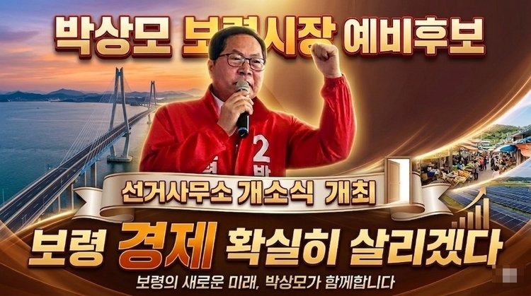 (뉴스인020 = 김성길 기자) 국민의힘 박상모 보령시장 예비후보가 지난 5일 오후 5시 지지자 500여 명이 참석한 가운데 선거사무소 개소식을 열고 본격적인 세 결집과 정책 행보에 돌입했다. 이날 행사장은 보령시민과 지지자, 당 관계자들이 대거 몰리며 경선 분위기를 달구는 열기로 가득 찼다.