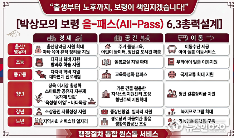 이날 개소식의 핵심은 박 예비후보의 대표 공약인 ‘보령 올-패스(All-Pass) 6·3 총력설계’ 발표였다. 이 구상은 출산부터 노년까지 6개 생애주기를 세로축으로, 경제·공간·이동의 3대 핵심 가치를 가로축으로 연결한 입체형 정책 모델로, 교육·복지·경제를 하나로 묶는 통합 설계라는 점에서 주목을 받았다.