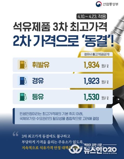 (뉴스인020 = 김나현 기자) ■ 석유제품 3차 최고가격 2차 가격으로 '동결'! (4.10.~4.23. 적용)