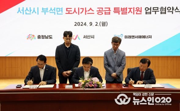 김태흠 지사는 2일 도청 대회의실에서 이완섭 서산시장, 박영수 미래엔서해에너지 대표와 ‘서산 부석면 도시가스 공급 특별 지원을 위한 협약’을 체결했다.