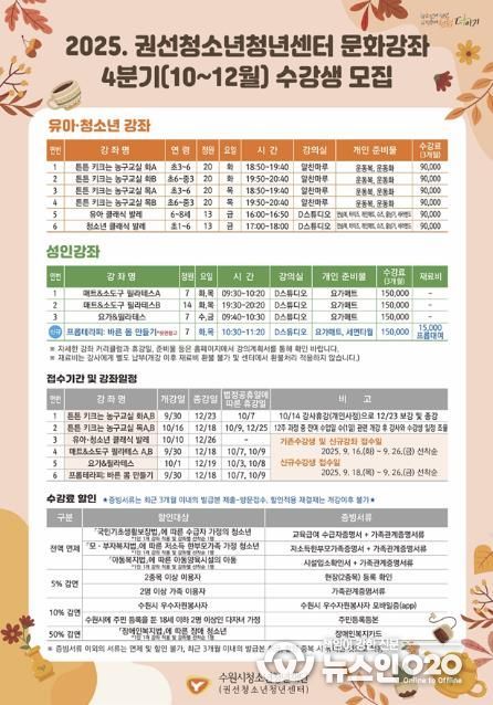 (뉴스인020 = 기자) 수원시청소년청년재단 권선청소년청년센터는 오는 9월 16일부터 9월 26일까지 지역사회 평생학습 문화강좌 4분기(10~12월) 수강생을 모집한다.