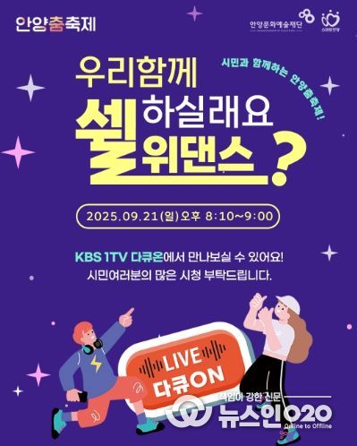 (뉴스인020 = 김성길 기자) 안양문화예술재단은 시민이 직접 기획하고 참여하는 ‘안양춤축제’가 오는 21일 저녁 8시 10분 KBS 1TV 다큐멘터리 ‘다큐ON’을 통해 전국 시청자들에게 소개된다고 밝혔다. 이번 프로그램의 제목은 “우리 함께 하실래요? 쉘 위 댄스”로, 거리와 광장이 무대가 되고 시민 누구나 주인공이 되는 축제의 현장을 생생하게 담아낸다.