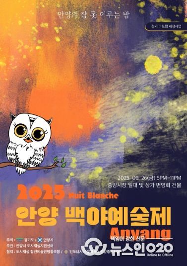 (뉴스인020 = 김성길 기자) 안양시는 이달 26일 오후 5시부터 11시까지 만안구 안양4동 안양중앙시장에서 청년들이 즐길 수 있는 ‘안양 백야예술제(Nuit Blanche Anyang)’를 개최한다고 19일 밝혔다.