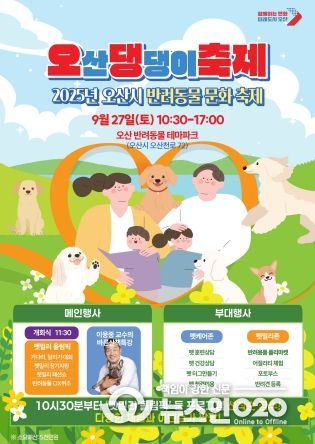 (뉴스인020 = 김성길 기자) 오산시는 오는 27일 오산 반려동물테마파크(오산천로 72)에서 ‘2025 오산 댕댕이 축제’를 개최한다. 시는 이번 축제를 통해 반려동물 복지와 교감 문화를 확산하고, 오산을 반려친화도시로 자리매김하겠다는 구상이다.