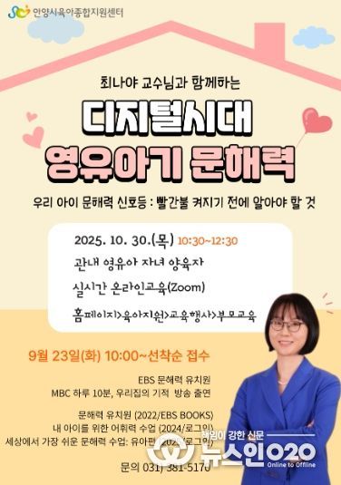 (뉴스인020 = 김성길 기자) 안양시가 오는 10월 30일 오전 10시 30분 영유아기의 문해력 발달 중요성과 올바른 양육 방법을 알아보는 양육자 1천명 대상 온라인 부모교육을 개최하고, 이달 23일부터 교육생을 선착순으로 신청받는다고 19일 밝혔다.