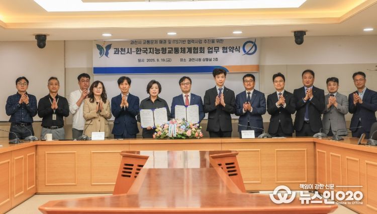 (뉴스인020 = 김성길 기자) 과천시는 19일 시청 상황실에서 한국지능형교통체계협회(ITS Korea)와 ‘교통문제 해결 및 ITS 기반 협력사업 추진’을 위한 업무협약을 체결했다. 협약식에는 신계용 과천시장과 한국지능형교통체계협회 허청회 회장이 참석해 협약서에 서명했다.