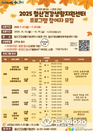 참가 신청은 연령에 따라 구분한다. 60세 미만은 광명시 평생학습 통합 플랫폼 ‘광명e지’(sugang.gm.go.kr)에서 온라인으로만 신청할 수 있으며, 회원가입이 필요하다. 60세 이상은 모집 기간 내 철산건강생활지원센터를 직접 방문해 광명시민 여부와 본인 확인을 위한 신분증을 제시하면 된다.