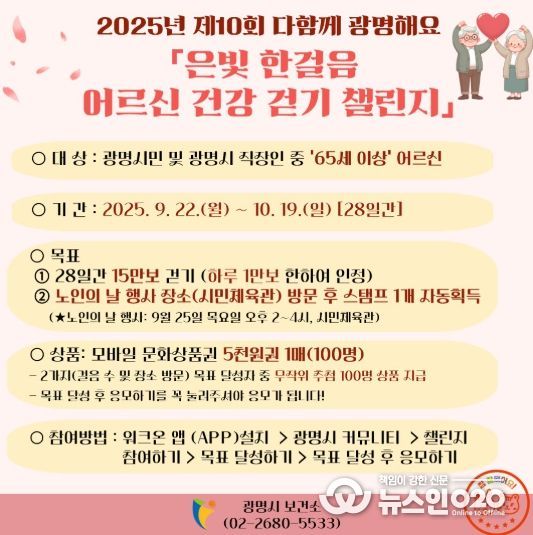 (뉴스인020 = 김성길 기자) 광명시 보건소는 어르신들의 건강 증진과 활기찬 노년 생활을 응원하기 위해 제10회 ‘은빛 한걸음 어르신 건강 걷기 챌린지’를 운영한다.