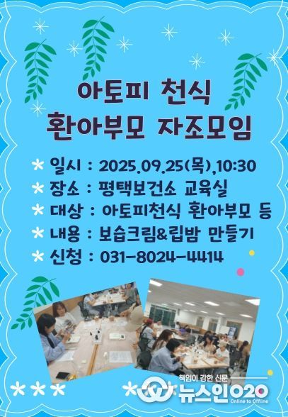 (뉴스인020 = 김성길 기자) 평택시는 지역 사회 중심의 알레르기 질환(아토피·천식 등) 예방관리 환경 조성을 위해 ‘아토피·천식 환아 부모 자조모임’을 운영하고 있으며, 오는 25일 열리는 3분기 모임에 함께할 신규 참여자를 모집한다.