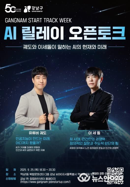 구민을 위한 AI 릴레이 강연도 마련됐다. 25일 오후 6시 30분 역삼1동 복합문화센터 강남씨어터에서 유튜브 채널 ‘안될과학’의 궤도가 ‘AI가 가져올 미래와 인간의 지혜’를, 프로 바둑기사 출신 이세돌이 ‘AI 시대, 인간만의 경쟁력’을 주제로 강연한다.