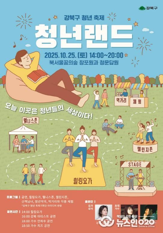 (뉴스인020 = 김성길 기자) 강북구는 오는 10월 25일 북서울꿈의숲에서 열리는 제2회 강북구 청년축제 ‘청년랜드’의 주요 프로그램인 △힐링요가 △웰니스존 △산책남녀의 참여자를 9월 22일(월)부터 사전 모집한다.
