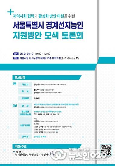(뉴스인020 = 김성길 기자) 전체 인구의 13.59%에 달하는 것으로 추정되는 경계선지능인을 위한 사회적 안전망을 구축하고, 실질적 대안을 모색하는 자리가 마련된다. 서울시는 생애주기별 맞춤형 평생교육부터 직업역량 개발, 정서·심리 상담, 금융 교육에 이르기까지 이들을 위한 촘촘한 지원 방안을 모색하기 위해 오는 24일 오전 10시, 서울시청 서소문청사 1동 대회의실에서 '서울시 경계선지능인 지원 방안 모색 토론회'를 개최한다.
