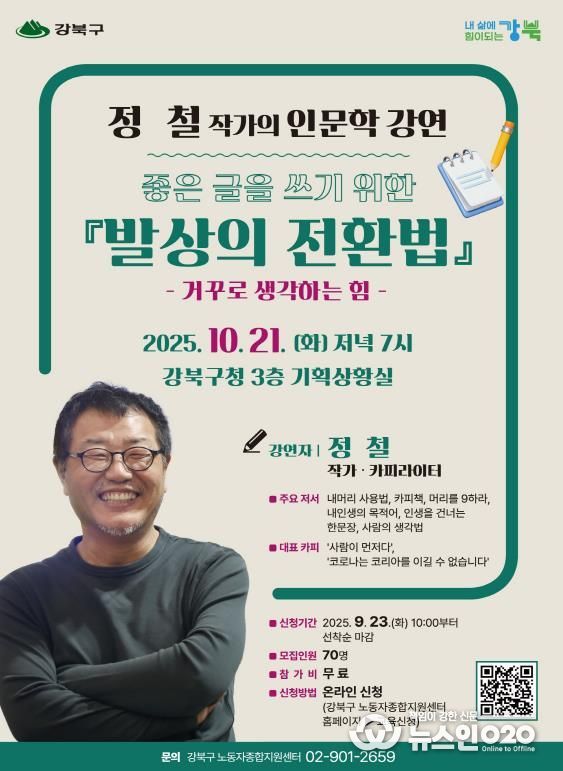 (뉴스인020 = 김성길 기자) 서울 강북구는 창의적인 사고와 새로운 시각을 나누기 위해 대한민국 대표 카피라이터이자 작가인 정철을 초청, ‘발상의 전환법’ 인문학 강연을 개최한다고 밝혔다.