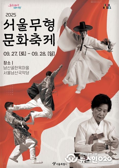 (뉴스인020 = 김성길 기자) 서울시는 9월 27일부터 28일까지 양일간 남산골한옥마을에서 '2025 서울무형문화축제'를 개최한다. 무형유산 보유자와 전승자, 시민이 함께하는 이번 축제에는 무형유산 24종목이 참여해 공연·시연·체험을 선보이며 남산골한옥마을을 ‘전통 문화의 장’으로 물들인다.