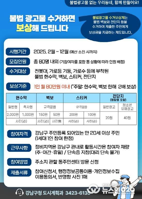 (뉴스인020 = 김성길 기자) 꿈이 모이는 도시, 미래를 그리는 강남구가 불법 유동광고물 근절을 위해 운영 중인 ‘수거보상제’의 참여 인원을 대폭 확대한다. 구는 주민 약 60명을 새롭게 모집해 더 많은 주민이 직접 거리 정비에 나설 수 있도록 했다.