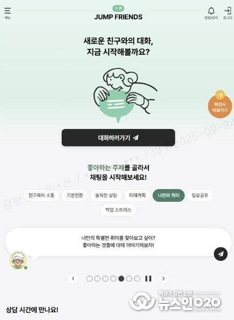 (뉴스인020 = 기자) 수원특례시가 생성형 AI 기반 고위험 고립 위기 청(소)년 공감상담서비스 ‘JUMP FRIENDS’(점프 프렌즈)를 22일 정식 오픈했다.